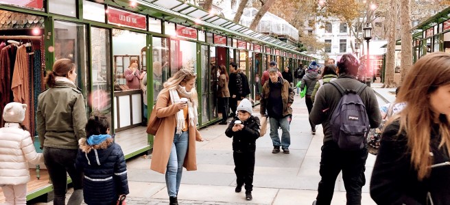 Madeline’s parents were taking her to the Winter Village at Bryant Park. Rather than take a taxi, they decided to walk from Penn Station on 34th Street to 6th Avenue, up to Bryant Park. Along the way people walked briskly, stopping and going, not all following the pedestrian street lights. Some bumping into Madeline and her parents as she held her mother’s hand tightly. Buildings lined every street and towered over the people below. Car horns sounded, people yelling, police whistles blowing. There was excitement all around.